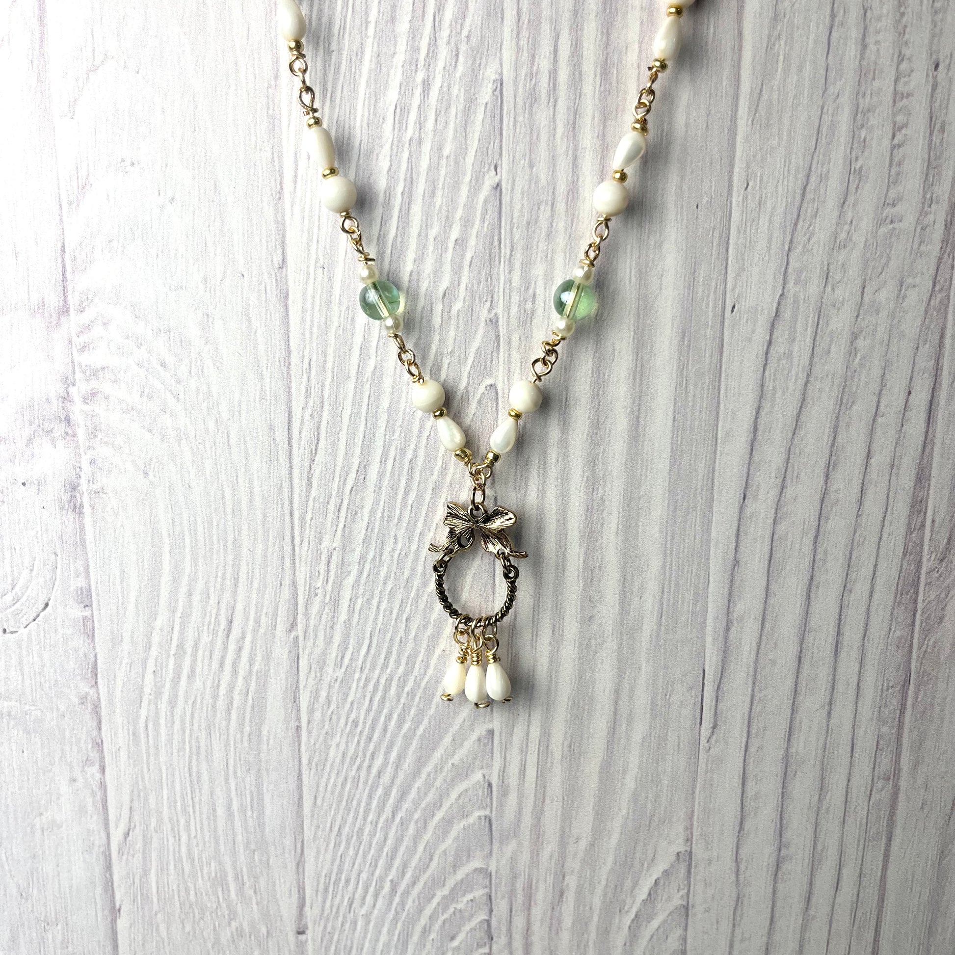 Inspired by the legendary Tudor queen, The Anne Boleyn Set is a romantic, handcrafted jewelry pairing that blends soft green glass beads with luminous white seashell beads. Each section is hand-wired, link by link, making this necklace and earring set a true one-of-a-kind piece—no duplicates, no mass production, only artisan craftsmanship. Elegant draped details and a vintage-style charm create a look that feels both historical and feminine, perfect for costuming, heirloom gifting, or wearing as a signature statement with modern clothing.