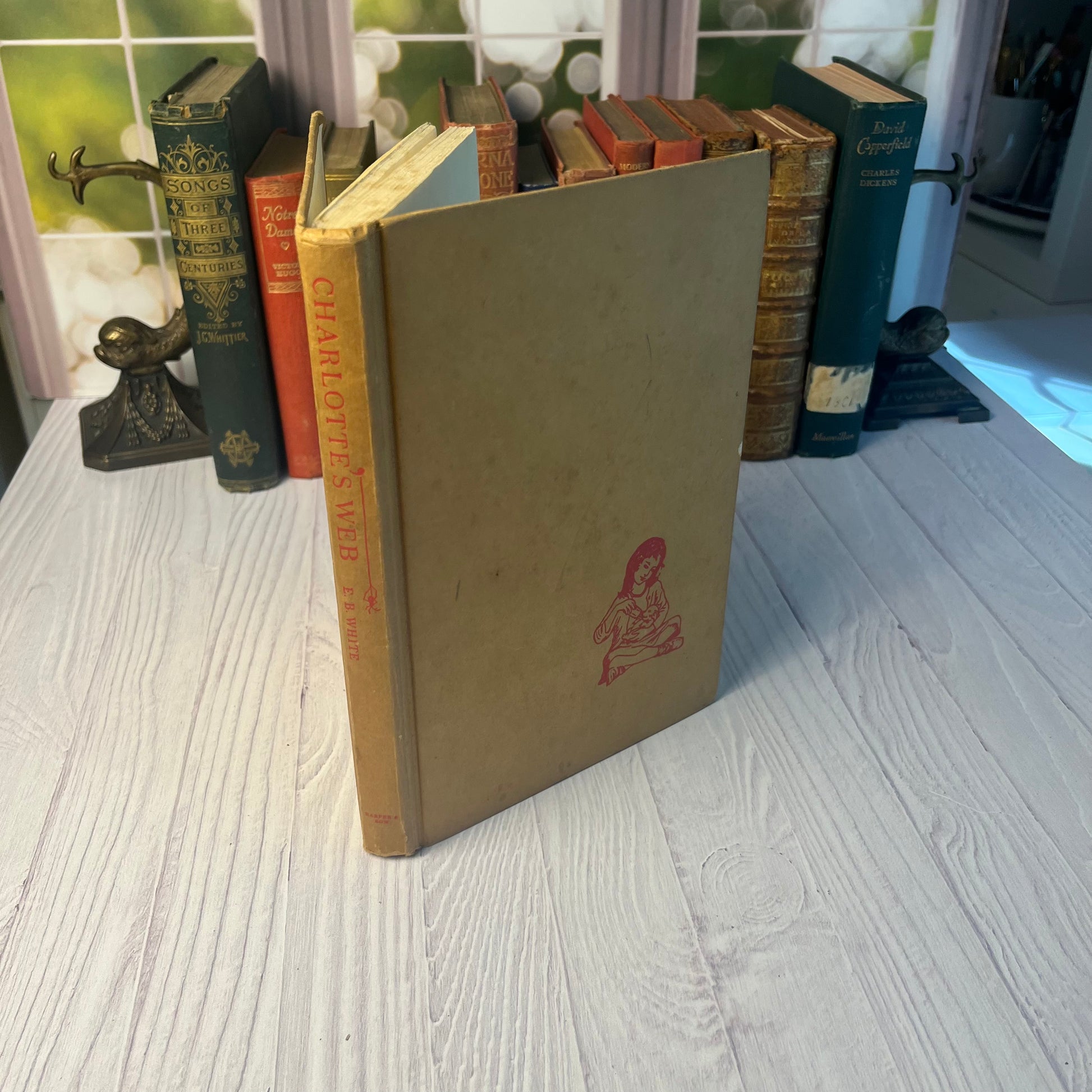 This 1952 edition of Charlotte’s Web is a well-loved treasure, rescued from a garage sale and ready to be cherished again. The brown hardcover shows gentle marks of time and is decorated with a red embossed illustration on the front. On the spine, the embossed title features Charlotte dangling from the apostrophe—a charming detail unique to this edition.